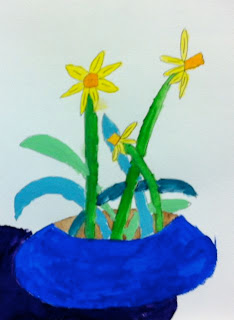 I found some great little daffodils that the students used for an observation painting. They had to include three flowers from three angles... and use layers of color to show the layers of leaves. A graduated background gave them practice in color mixing.